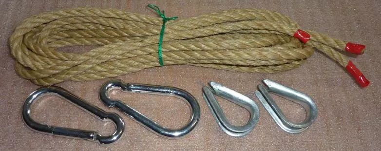 Comprises two welded screw eyes for use in wooden beams, ceiling joists, etc., together with two lengths of weatherproof polyhemp rope (2 x 3m) for hammock height adjustment.